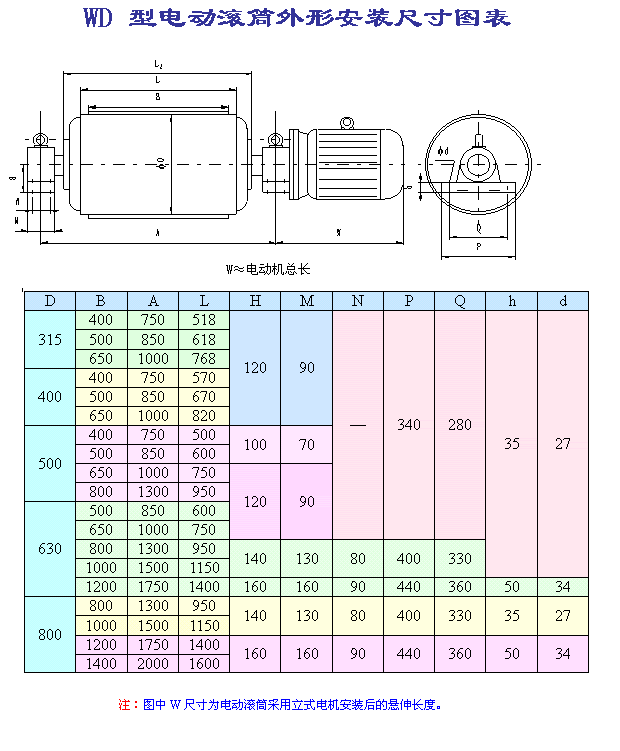 (1).因目前外裝式電動(dòng)滾筒尚未制定相關(guān)行業(yè)標(biāo)準(zhǔn),本廠將該型號(hào)電動(dòng)滾筒首位代號(hào)用W(“外裝”的首位漢語(yǔ)拼音)表示。外裝式電動(dòng)滾筒外置電機(jī)可分為立式電機(jī)和臥式電機(jī),用戶訂購(gòu)時(shí)請(qǐng)加以說(shuō)明;