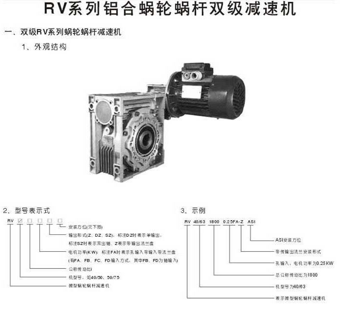 RV系列鋁合金蝸輪蝸桿雙級減速機(jī)雙級RV系列鋁合金蝸輪蝸桿減速機(jī)外觀結(jié)構(gòu)型號表示法